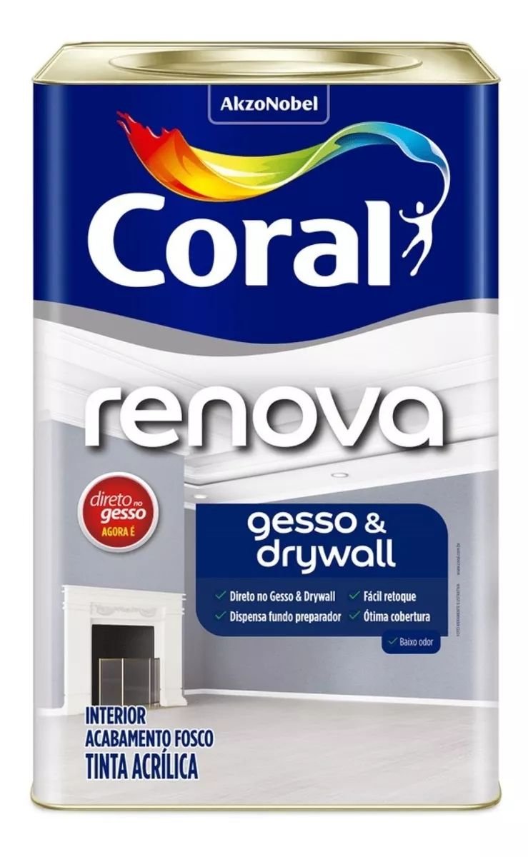 A tinta Renova Gesso e Drywall é especialmente desenvolvida para aplicação diretamente sobre o gesso sem a necessidade de uso de fundo, pois a tinta não amarela com o tempo e fixa o pó solto específico do gesso, de forma que a superfície não sofra descascamento. Como se não bastasse, a Renova Gesso e Drywall tem boa cobertura, rendimento e fácil retoque. Possui acabamento fosco.