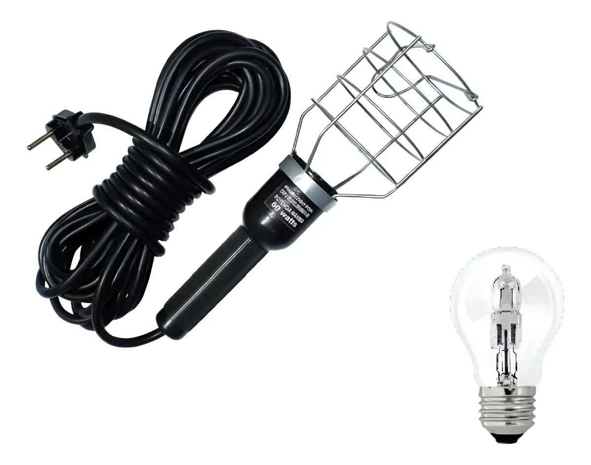 Extensão com proteção aramada, 5 metros de cabo e plugue normatizado. Acompanha lâmpada halógena de 60w.